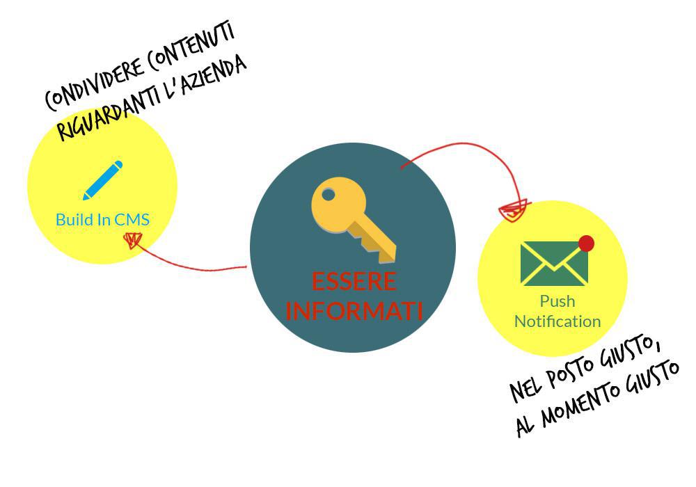 - il CMS interno: consente di creare articoli, video, immagini o suoni unici per l'applicazione. L'interesse è quello di creare contenuti permanenti, disponibili per il dipendente in qualsiasi momento e rappresentare, quindi, una sorta di enciclopedia aziendale.
