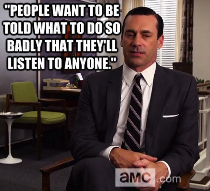 Perché abbiamo messo tanta fiducia nei dirigenti, esperti, medici ed altre persone che ricoprono alte posizioni? Perché sono rispettati, credibili, hanno autorità sul loro pubblico e crediamo che sappiano cos'è meglio per noi. Abbiamo la necessità di fidarci delle persone che ricoprono posizioni di autorità e questo viene spesso costruito attraverso le loro carriere professionali o il livello di conoscenza. I pubblicitari e le agenzie di comunicazione scelgono medici o altre persone che hanno un'immagine credibile, per far parte delle loro campagne. Anche i vestiti, le uniformi, i gadget contribuiscono a sostenere quest'immagine.