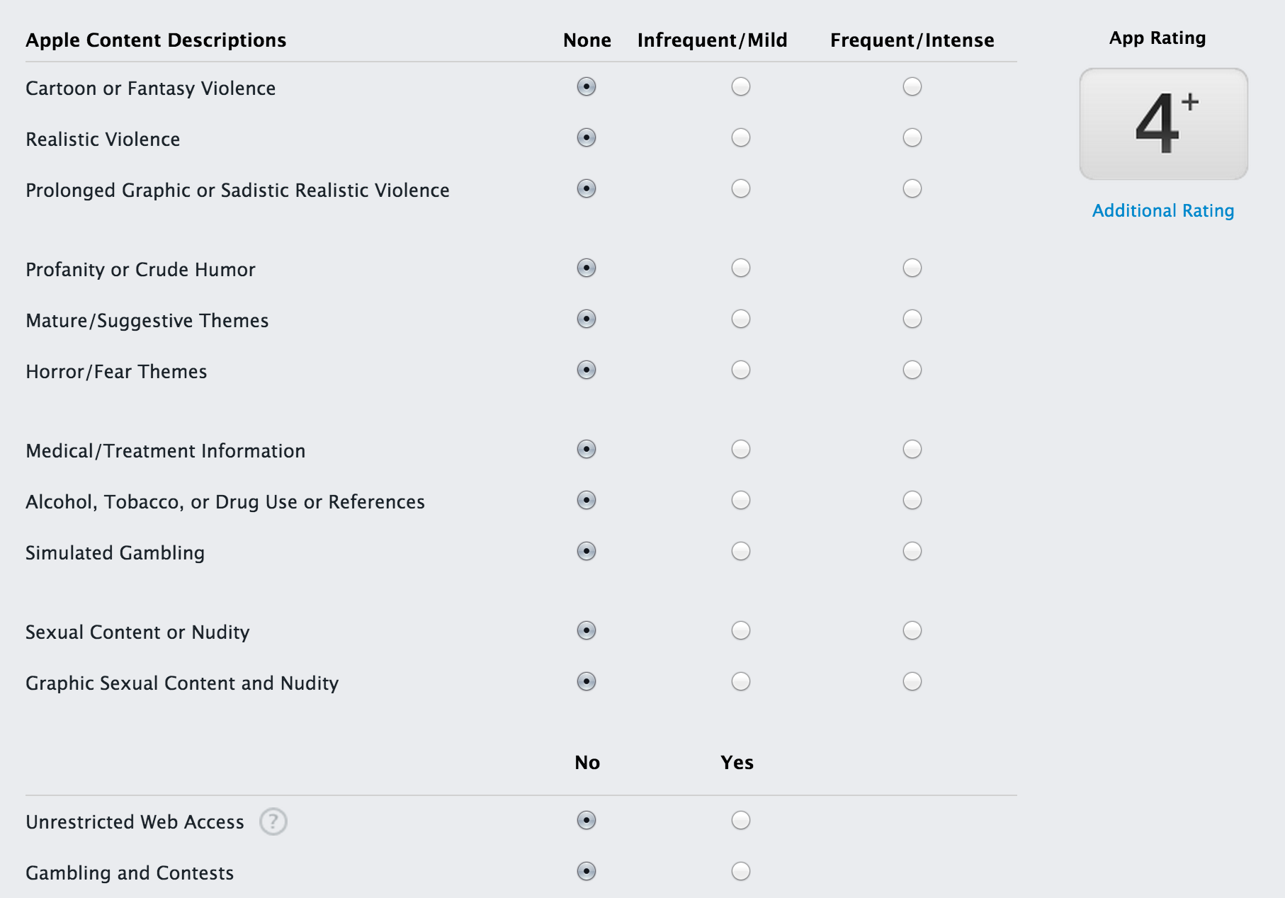 5. Compilare correttamente i meta data richiesti su iTunes Connect; Inserite i giusti Tag, delle immagini appropriate, scegliete il giusto rating ( Se la vostra app tratta di alcolici o sesso, ricordatevi di menzionarlo nelle questionario, altrimenti la vostra app verrà rigettata), inserite i dati di contatto e controllate che gli URL funzionino correttamente. Tutto deve essere trasparente e comprensibile per l'utente finale.