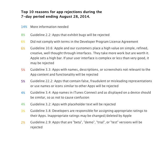 Tutte le app sviluppate negli ultimi anni, hanno di certo portato un po' di lavoro extra al team di review di Cupertino. Forse è proprio questa la ragione della comparsa della Top 10 delle ragioni di rifiuto da parte di Apple . Una lista di tutte le ragioni di rifiuto dell'ultima settimana di Agosto 2014, tra cui appunto la mancanza di informazioni (14%), Bugs (8%), Descrizione e screenshot non rilevanti (6%)...