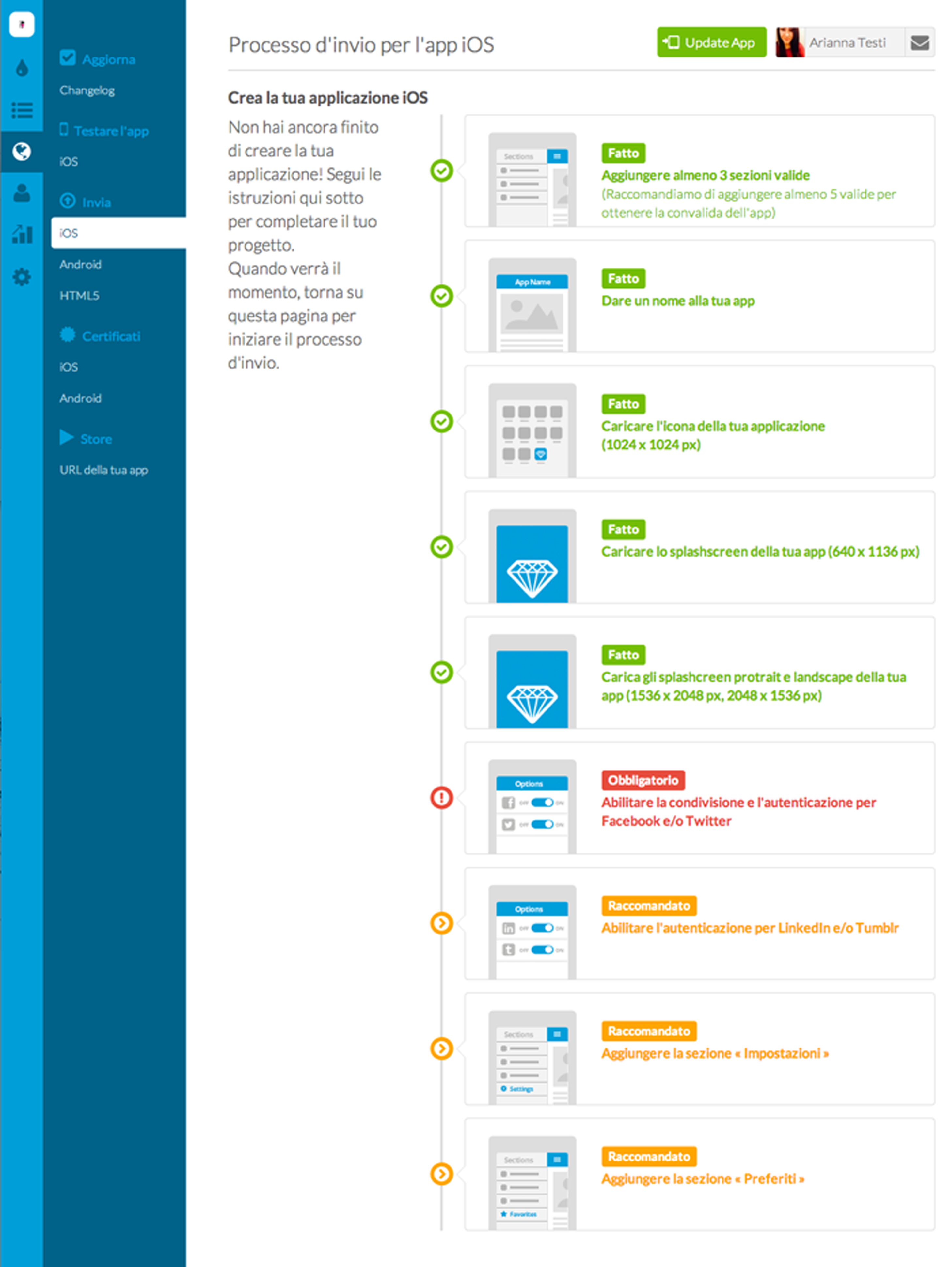 7. GoodBarber prima della pubblicazione vi fa trovare una lista di passaggi obbligatori/consigliati. Qui sotto trovate lo screenshot relativo, così anche se non state utilizzando GoodBarber avrete una linea guida da cui partire. Se seguirete questi consigli, eviterete futuri dispiaceri ;)