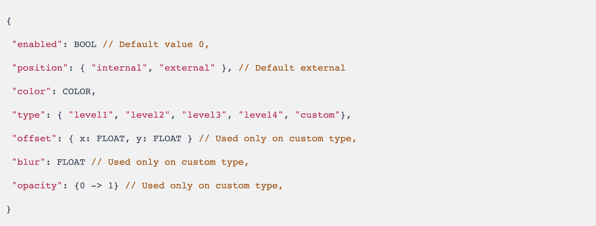 Una volta installata l'estensione JSON, è necessario aggiungere l'oggetto ombra. Ecco il formato JSON di questo oggetto: