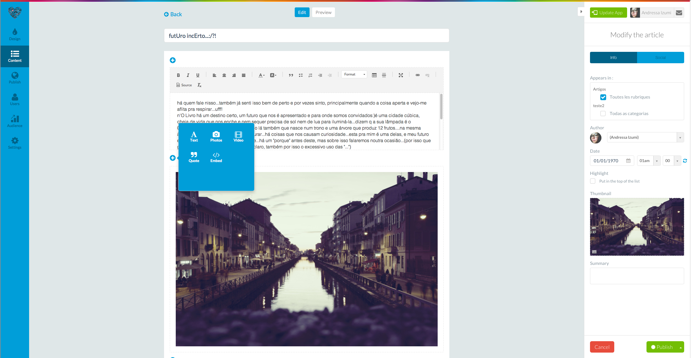 Se volete creare un'app con fonti di contenuto diverse, come testi, immagini e video, dovete semplicemente aggiungere una sezione CMS e divertirvi con la creazione dei vostri post. Il CMS interno vi offre, inoltre, la possibilità di pubblicare immediatamente, salvare come bozza o mettere l'articolo in attesa di pubblicazione. Questo diventa molto utile se non volete perdere quanto avrete già creato, ma l'articolo non è ancora pronto per essere pubblicato, oppure se avete finito l'articolo ma volete pubblicarlo in una data specifica.