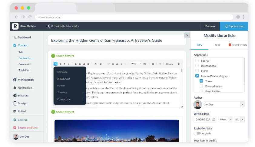 Una volta installata, andate nel menu Contenuto del vostro back office e create un nuovo contenuto. Potete scegliere qualsiasi tipo di contenuto in cui avete accesso all'editor di testo del CMS (aggiungere un articolo, un video, un podcast, un evento o un luogo). Nell'angolo in alto a sinistra dell'editor di testo, si riconosce l'ormai familiare icona degli strumenti AI. Facendo clic su questa icona si accede alle funzioni dell'assistente AI.