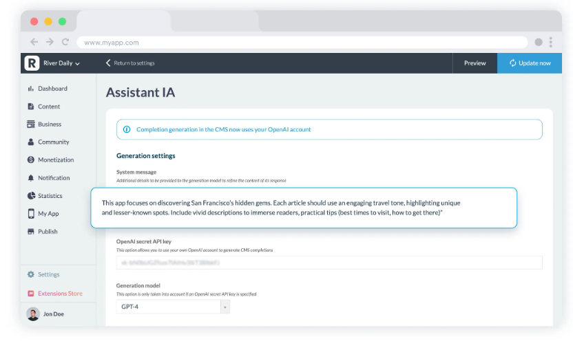 Se si dispone di un account OpenAI, è possibile inserire la propria chiave API segreta in modo da non dipendere più dalle quote offerte da GoodBarber. Non ci sarà più un limite di utilizzo da parte di GoodBarber. I token utilizzati dall'assistente AI saranno conteggiati direttamente nel vostro account OpenAI.