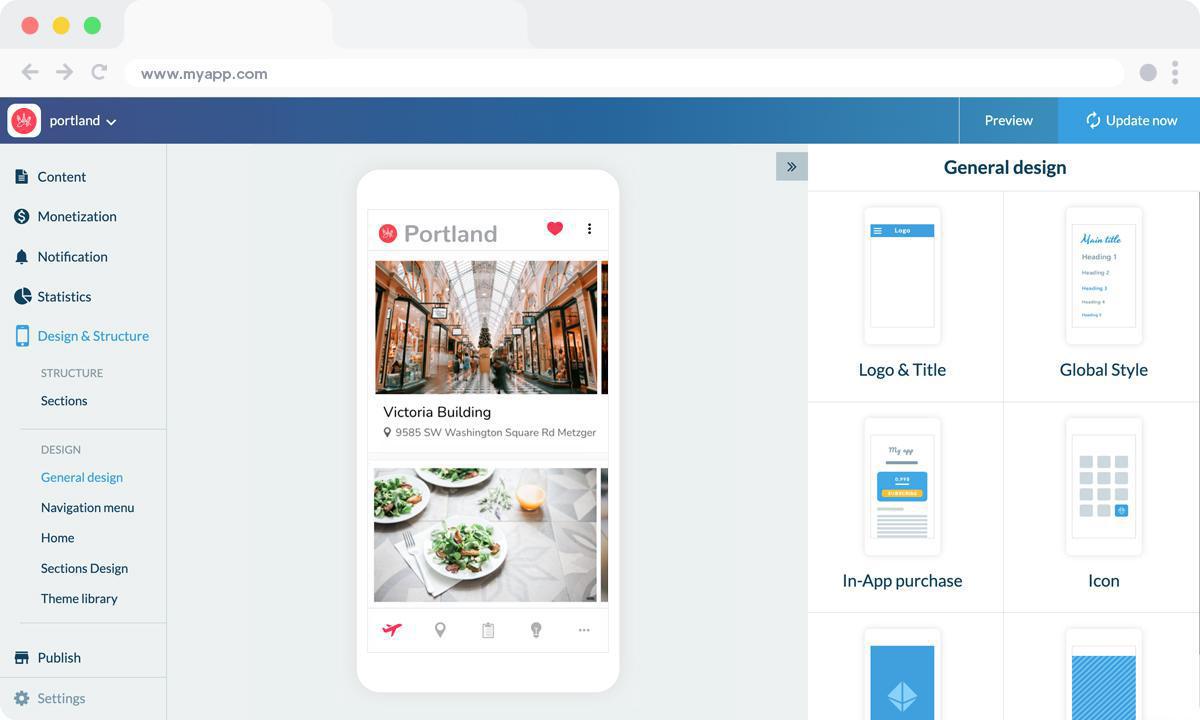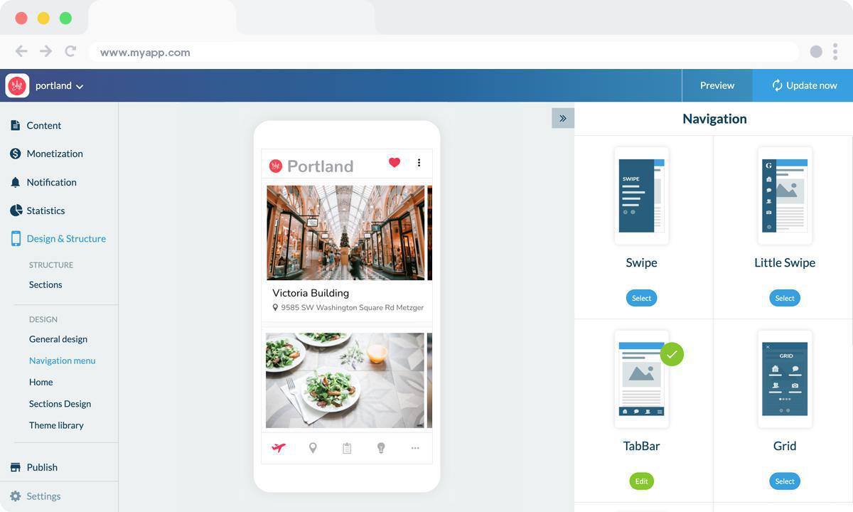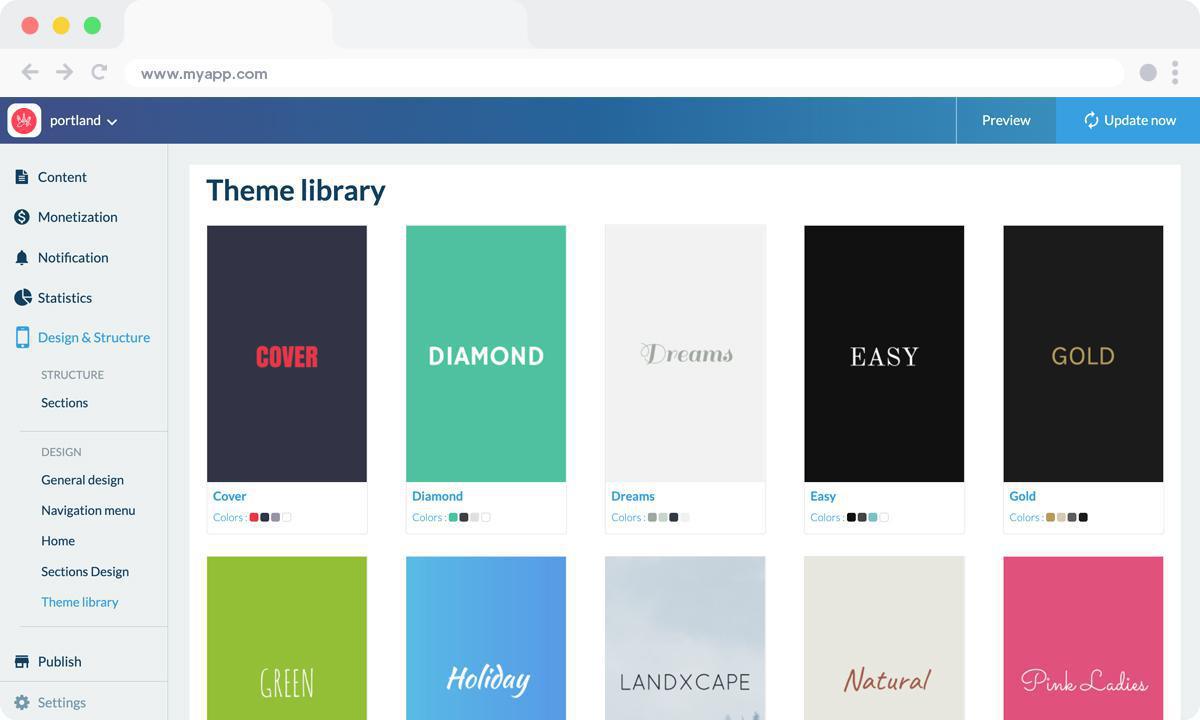 Nel back office troverai più di 25 temi diversi (sempre in aumento) creati dai nostri designer che possono essere utilizzati come punto di partenza per la tua app.