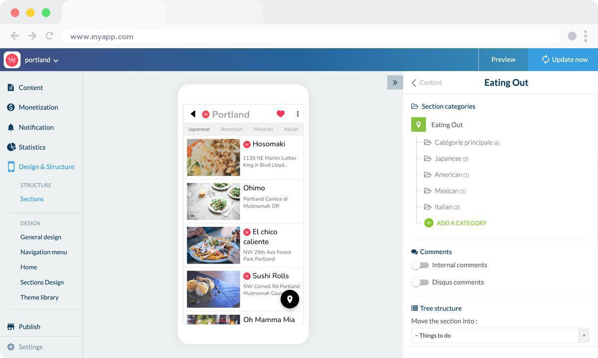 La creazione di categorie può essere fatta in differenti sezioni (articoli, video) ed è uno strumento efficace per rendere l’app più leggera. Nella sezione Eating out ad esempio, potremmo realizzare delle categorie per tipo di cucina (italiana, giapponese, messicana…) mantenendo tutte le informazioni in una sola sezione, mentre filtriamo i risultati.