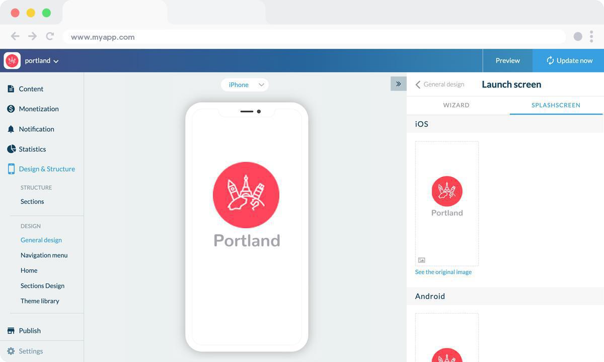 La schermata iniziale è la prima cosa che gli utenti vedranno all’apertura dell’app (prima della Home). Verrà visualizzata per pochi secondi, mentre i contenuti della tua app sono in fase di caricamento (anche su browser). Nel nostro esempio, il designer ha creato lui stesso lo splash screen, è però anche possibile crearlo direttamente dal back office utilizzando il nostro Wizard.