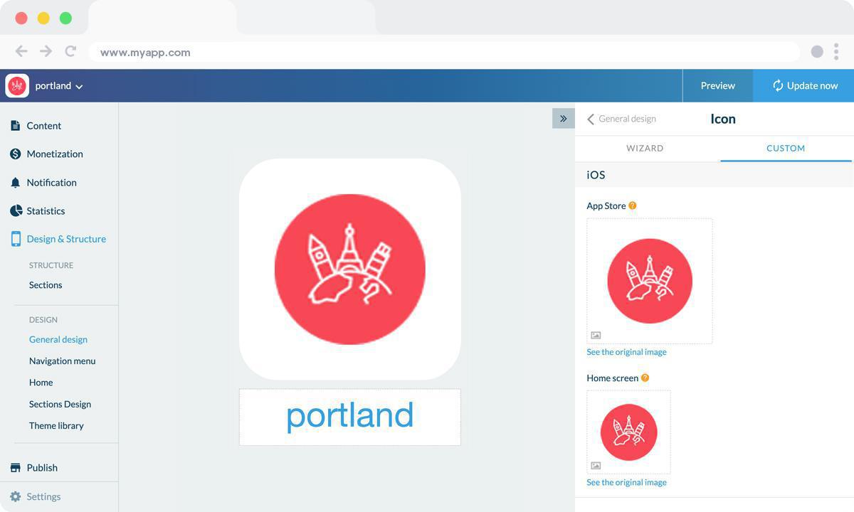 Per quanto riguarda l’icona dell’app devi rispettare le diverse dimensioni richieste, per ognuno dei sistemi operativi e per la web app. Creare una buona icona può essere complicato, c’è poco spazio per la creatività e per rappresentare al meglio le funzionalità dell’app. Potrebbe essere inoltre necessario modificare il logo in qualche modo per far si che si adatti bene al formato quadrato.