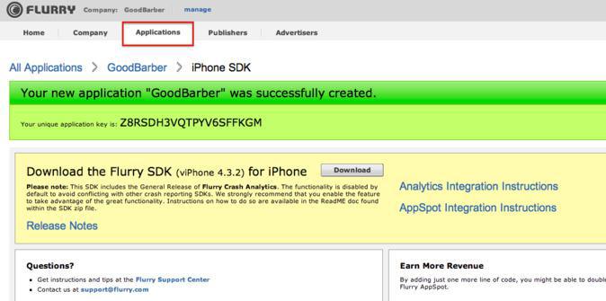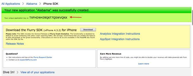 Una volta fatto, verrete indirizzati nuovamente sul sito di Flurry ed ecco che la vostra applicazione è pronta.