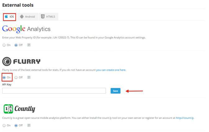 Scegliere la pagina giusta in base alla piattaforma, ciccare su "On" sotto Flurry e incollare l'Api Key. Ovviamente cliccare su "Salva"