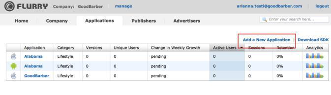 Per aggiungere un'altra piattaforma, tornate su Flurry e cliccate su "Applications" nel menu in alto, e successivamente su "Add new application".