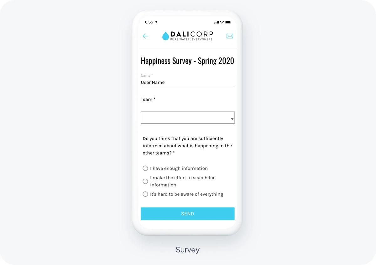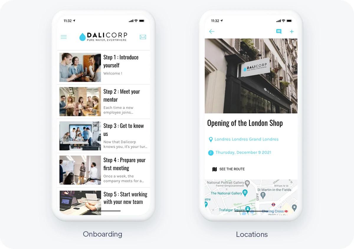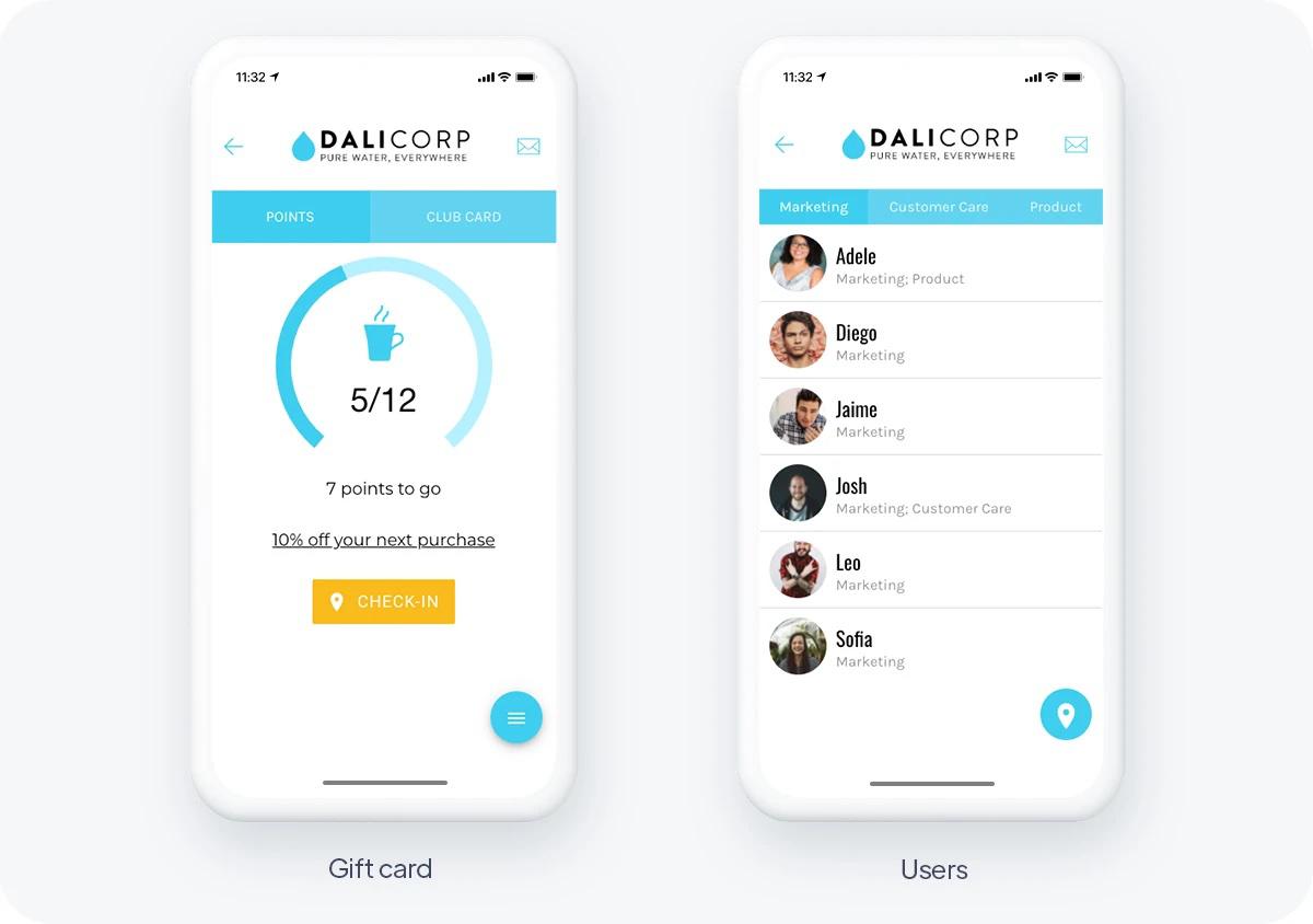 Dalicorp è l'applicazione di comunicazione interna di un'azienda innovativa specializzata nella distribuzione di bottiglie d'acqua, che ha un approccio eco-responsabile e rispettoso dell'ambiente. Gli obiettivi di questa applicazione sono molto chiari: informare, unire e coinvolgere gli impiegati dell'azienda.