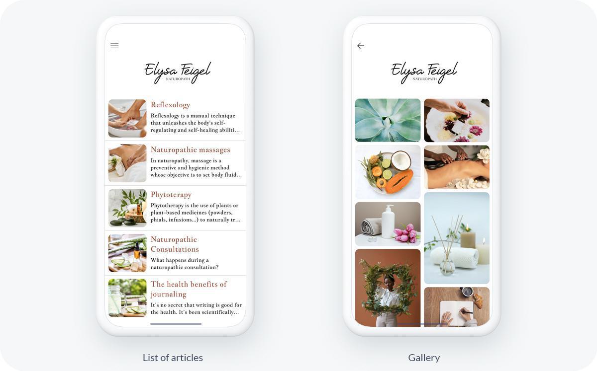 Dopo aver scelto il design, è il momento di affrontare la struttura dell'app. L'obiettivo è principalmente quello di presentare i servizi e di offrire la prenotazione online degli appuntamenti. Per Elysa Feigel, abbiamo volutamente mantenuto il contenuto dell'app il più semplice possibile. La homepage dell'app ha pochi widget ma è molto chiara. Prima di tutto, e per mettere subito il cliente a proprio agio, un widget Link con un modello di Slideshow molto visivo che rimanda a una sezione About, in cui la naturopata presenta il suo background e i suoi valori.