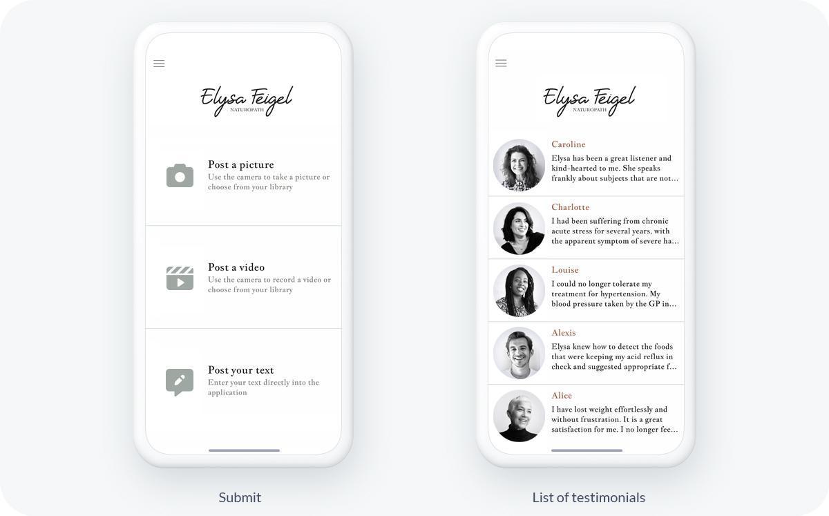 Questo è esattamente ciò che abbiamo fatto nell'app di Elysa Feigel. I clienti inviano le loro recensioni corredate da una foto attraverso la sezione di invio. Le recensioni raccolte vengono poi ripubblicate in una sezione Articoli ordinata.