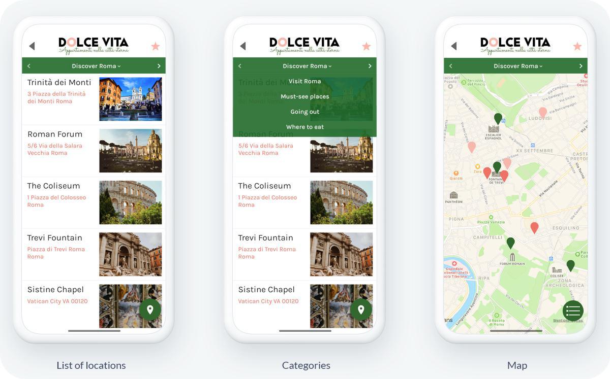 - Avete la possibilità di classificare questi luoghi in modo che gli utenti della vostra app possano trovare esattamente il luogo che stanno cercando. Nell'app Dolce Vita ci sono 4 categorie: La categoria "Luoghi imperdibili", che elenca i tour imperdibili da fare a Roma. La categoria "Dove mangiare", in cui il gestore elenca i suoi ristoranti preferiti, e infine la categoria "Dove uscire", in cui sono elencati i consigli per la vita notturna.
