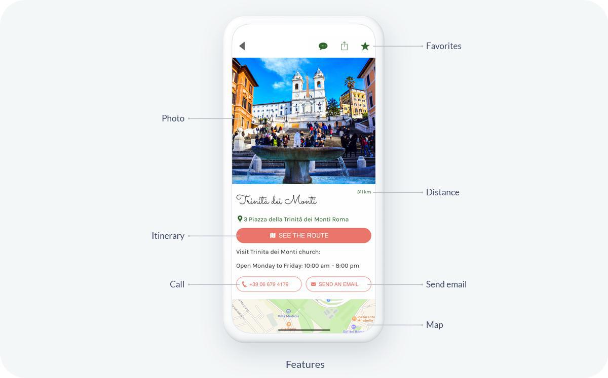 L'app consente di presentare i luoghi da visitare direttamente su una mappa, in modo che i viaggiatori possano raggiungerli senza ostacoli e accedere a un percorso dal pulsante "vedi il percorso". Sono disponibili diverse visualizzazioni dei luoghi: