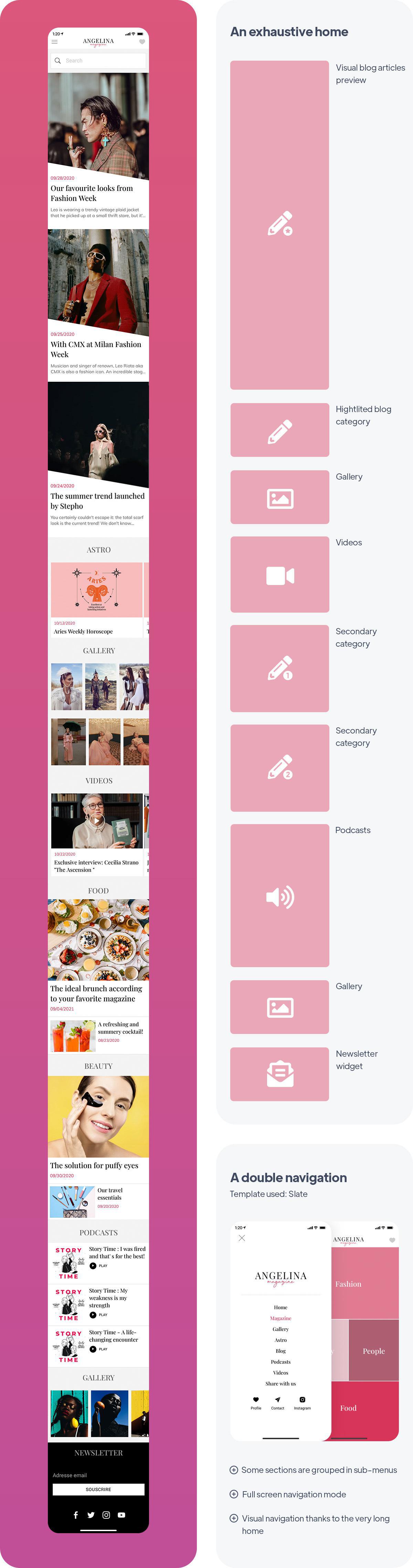 Per rappresentare le app di notizie più specializzate, l'app Angelina è l'esempio giusto. Trattando di moda, si rivolge ad appassionati, spesso già esperti o professionisti nel loro campo. Poiché la moda può essere legata all'arte, era essenziale offrire un'app con un design elegante e una home che si identificasse molto con i colori della rivista.