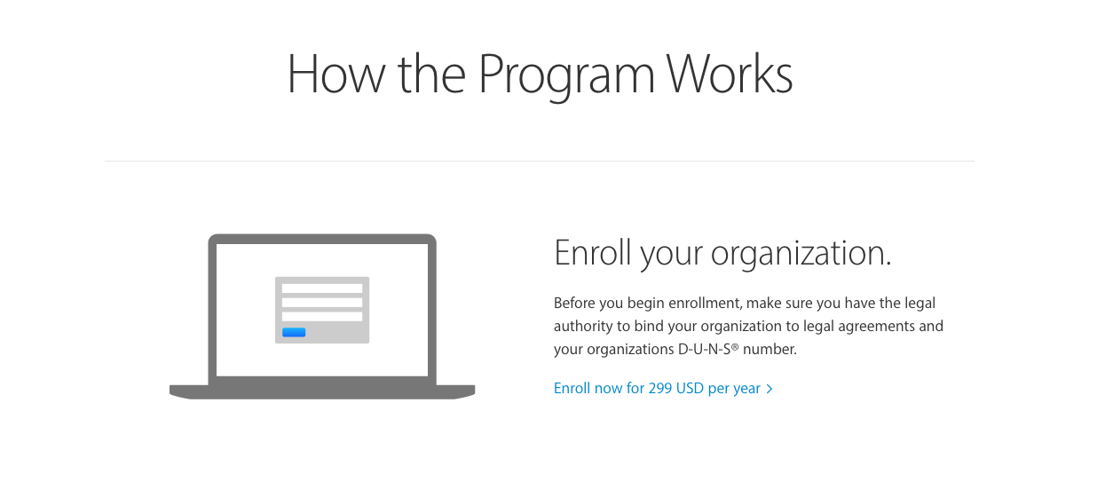 Per distribuite la tua app iOS al di fuori degli store, devi come prima cosa aprire un account Apple Developer Enterprise .