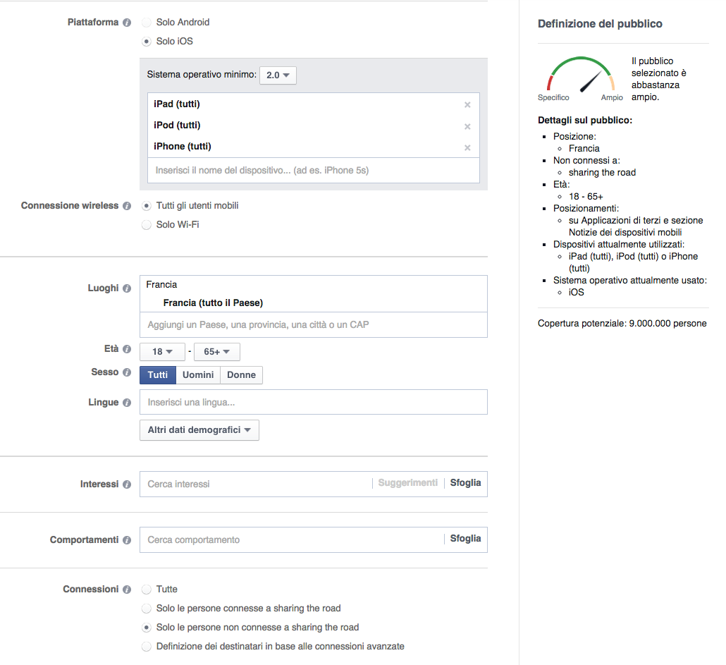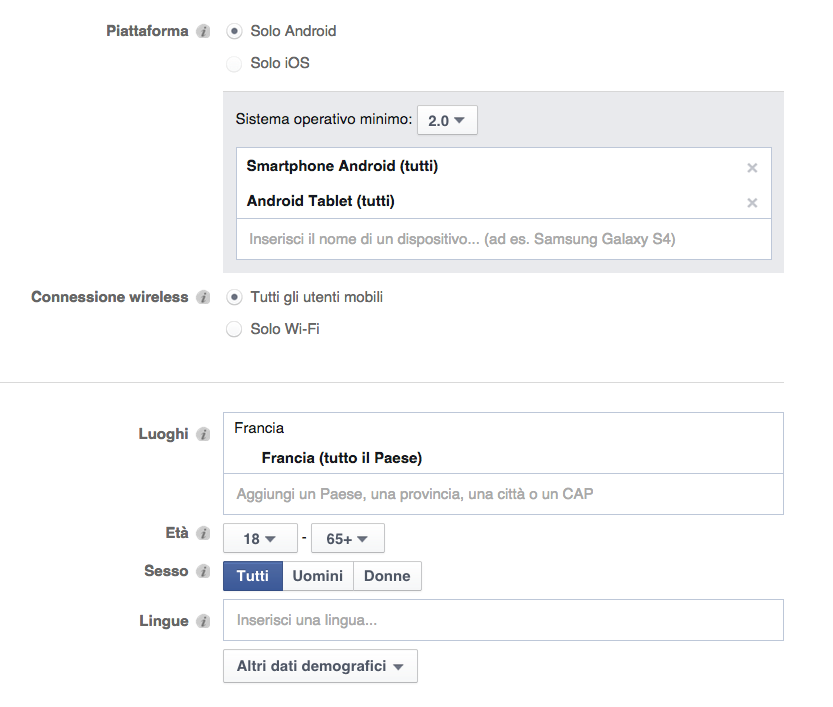 Altrimenti puoi creare il tuo audience definendo il dispositivo di utilizzo (iOS, Android, Operation System iOS 6.5, iPod, iPad, ecc..), connessione wireless (tutti gli utenti mobile, WiFi only), localizzazione, età, genere, interessi, comportamento o altri dati demografici.