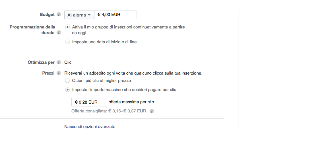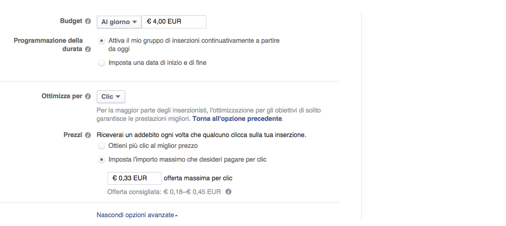 Puoi impostare un budget giornaliero o un budget totale. Puoi anche scegliere di collegare il tuo budget a l'opzione CPC (cost per click) scegliendo o la modalità "Ottieni più clic al miglior prezzo" o "Imposta l'importo massimo che desideri pagare per clic".