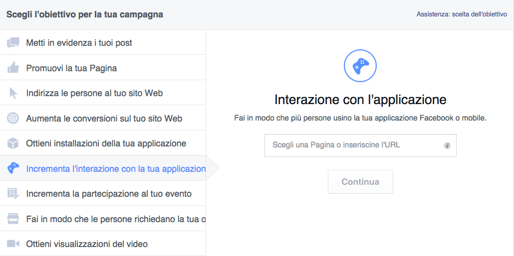 Scegli "Ottieni installazioni della tua applicazione" come obbiettivo della tua campagna, e incolla l'URL della tua app sullo store (App Store o Google Play) nel campo dedicato, o se la tua app ha già un'app Facebook, sceglila dal menu a tendina.