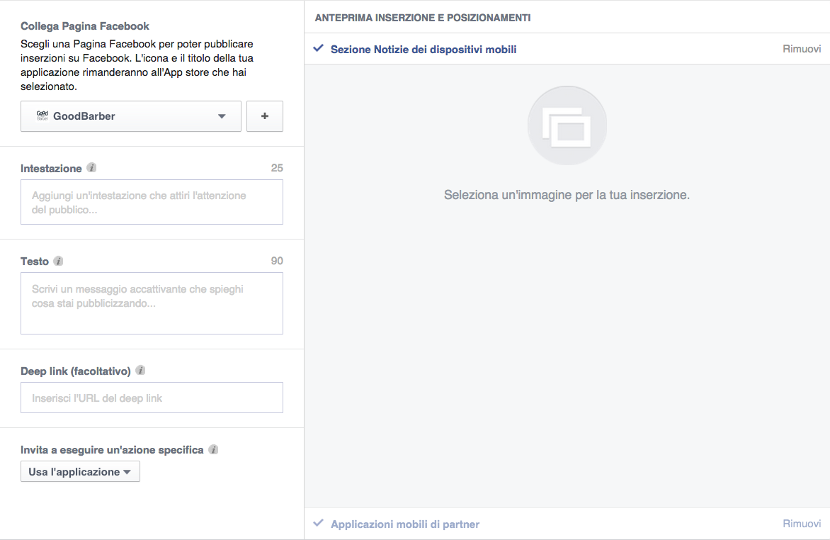 Connetti la tua campagna con una pagina Facebook rilevante per l'app e personalizza l'annuncio aggiungendo un titolo, un testo di massimo 90 caratteri, un call to action ( Usa l'app, Acquista ora, Gioca, ...), un deep link [Facoltativo] (URL verso una specifica sezione della tua app). Infine carica l'icona della tua app (75x75 pixel).