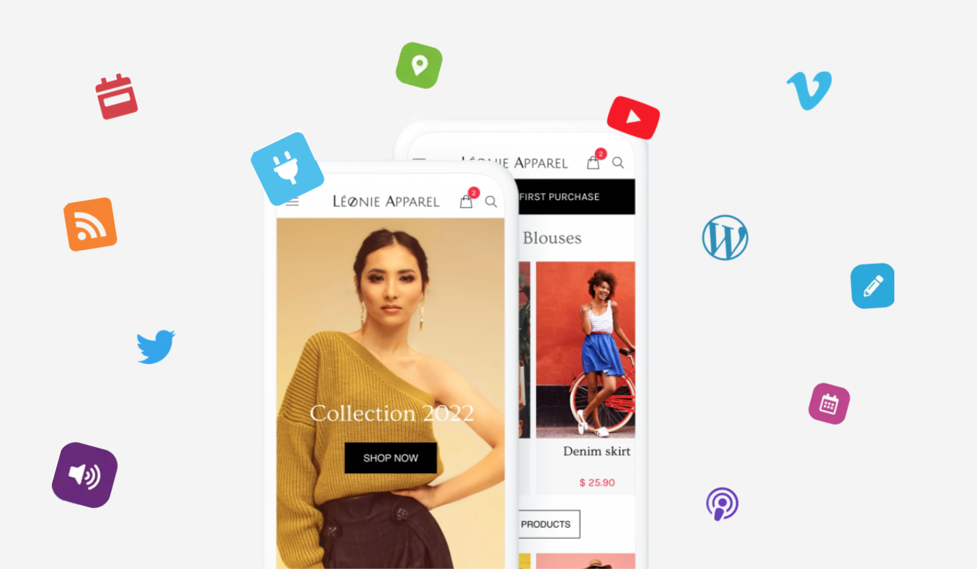 - Feed RSS: collega i tuoi articoli esterni e mostrali in una sezione della tua app per lo shopping, tramite una sezione RSS.
