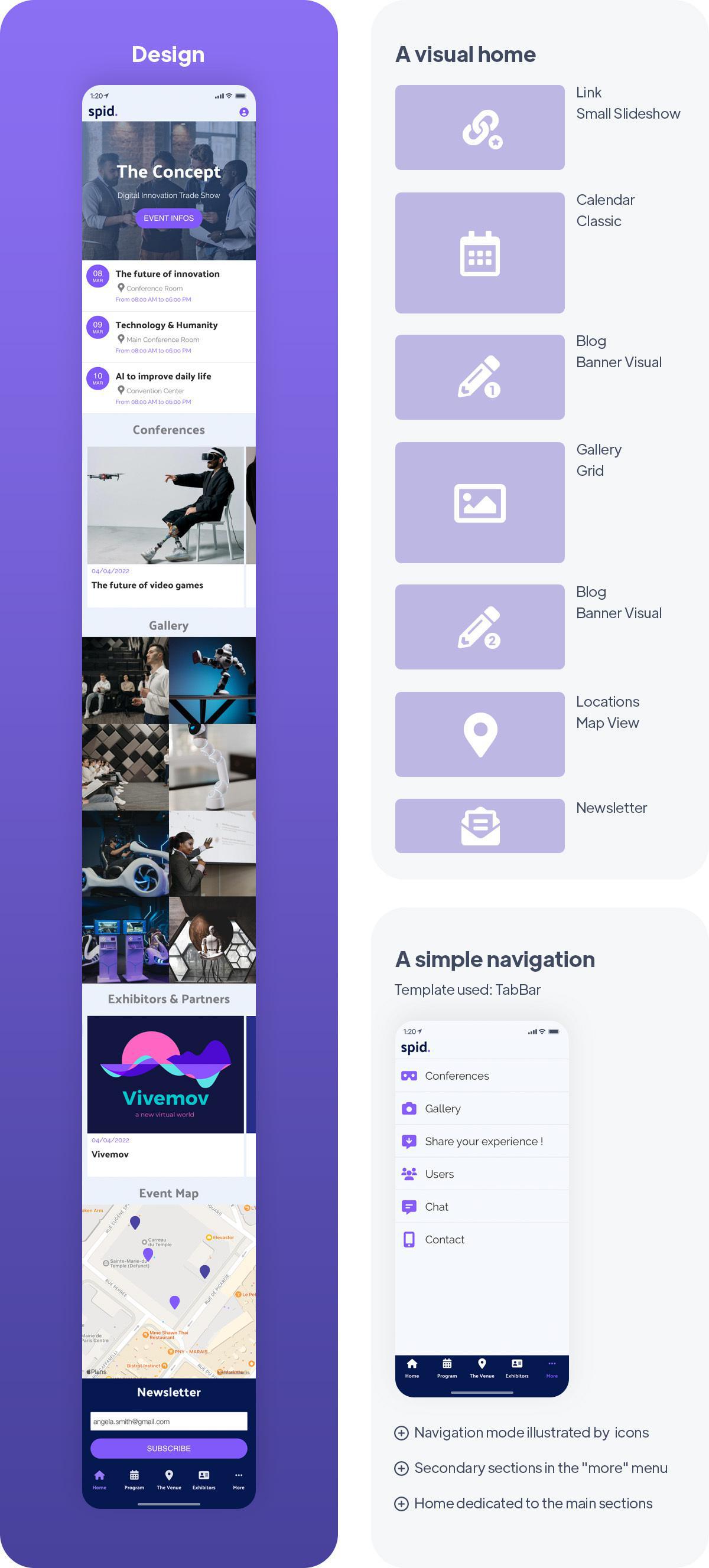 La chiave di un'app ottimale è la creazione di una Home ben strutturata. La Home dell'app SPID, ad esempio, mette in evidenza le categorie più importanti. In alto, c'è un primo widget che rimanda alla sezione Concept, che presenta l'evento, prima di lasciare spazio alla sezione Calendar che evidenzia il programma, indicando gli orari e i luoghi chiave. C'è poi un'anteprima delle diverse conferenze, seguita da un widget della sezione Gallery, che dà un tocco visivo e un'estetica interessante e coinvolgente all'app. Subito dopo sono evidenziati i partner e gli espositori, seguiti dalla sezione Mappa che consente agli utenti di trovare l'itinerario dell'evento. Infine, è presente un widget per la newsletter, in cui gli utenti possono inserire il proprio indirizzo e-mail ed essere informati regolarmente sull'evento. Questa è anche un'ottima strategia di marketing per raccogliere dati rilevanti!