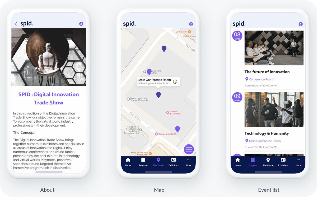 Ricordate di aggiungere immagini alla vostra app! Prima di tutto, le immagini miglioreranno la vostra app, ma porteranno anche un lato immersivo. Immergeranno l'utente in un'ambientazione, un universo, e gli permetteranno di visualizzare la vostra fiera. Le immagini scelte devono essere di alta qualità e riflettere la professionalità della vostra fiera, in modo da conferirvi credibilità. Questo è uno degli obiettivi principali del design: rivelare l'identità di un marchio, trasmettere messaggi ed emozioni. L'app SPID ha una sezione Galleria, dove si possono trovare molte fotografie dell'evento. Altri elementi come le icone e la tipografia non devono essere lasciati al caso. Ogni dettaglio è importante nel design di un' app.