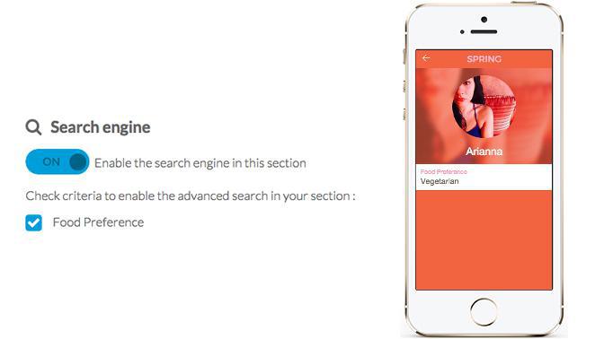 È quindi possibile impostare la ricerca avanzata in modo che l'utente finale possa per fare una ricerca anche all'interno di uno o più campi dropdown e trovare quindi altri utenti con le stesse preferenze alimentari.