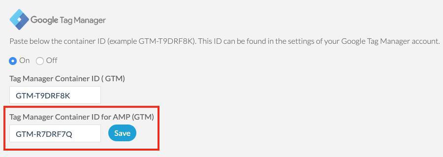 Nel blocco Google Tag Manager, fai clic su ON, inserisci l'ID del tuo contenitore e fai clic su Salva.