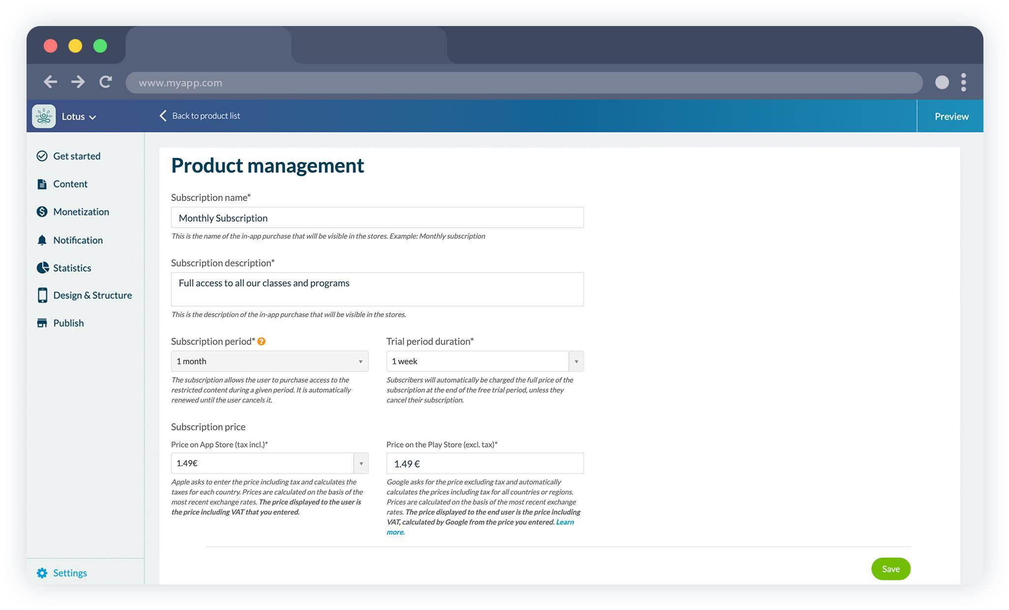 Troverai molti vantaggi nell'offrire abbonamenti nella tua app. Tra questi, il fatto che non ci sono spese per la carta di credito, ma soprattutto che per i tuoi utenti l'acquisto in-app offre una grande esperienza e un valore aggiunto senza dover lasciare l'app. Non c'è bisogno di inserire i dati della carta, tutto è collegato ai loro account sulle rispettive piattaforme (iOS o Android).