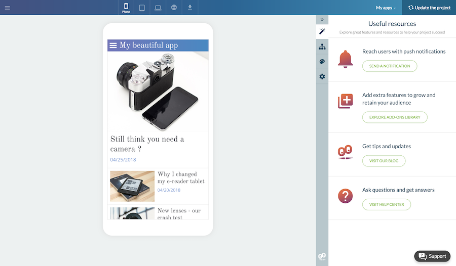4.5 è una versione che consolida la versatilità di GoodBarber per creare le app del futuro. Ogni volta, GoodBarber affronta una doppia sfida. Progetta lo strumento che crea app multipiattaforma e immagina l'interfaccia che ti consente di sfruttare la potenza di questo strumento nel modo più intuitivo possibile.