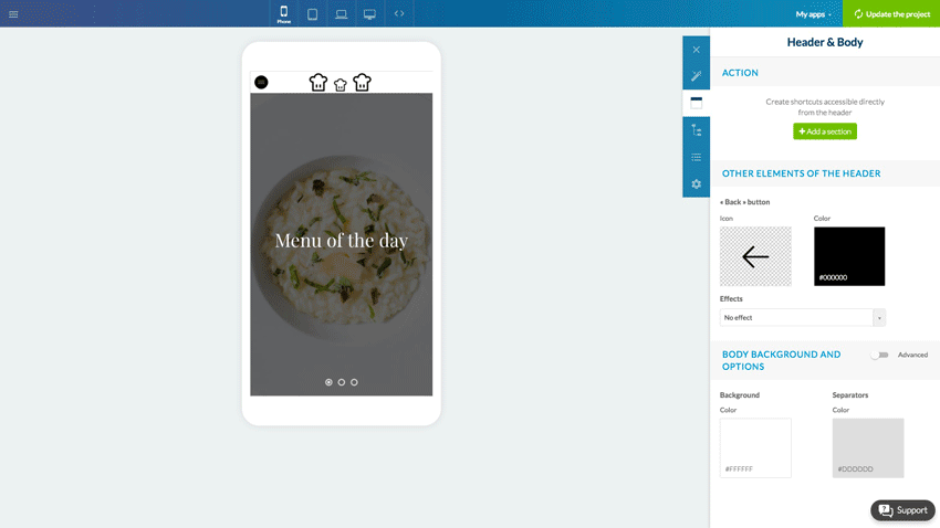 È possibile personalizzare l'header in modo autonomo sezione per sezione. Per esempio in un'app di cucina potresti avere l'intestazione di un certo tipo nella sezione Ricette e una totalmente diversa nell'area dedicata agli Eventi. Questa opzione ti concede la possibilità di avere una certa flessibilità, assicurati però di mantenere una certa coerenza all'interno dell'app.