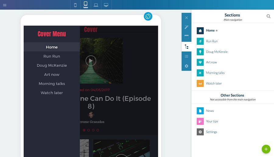 Prendiamo come esempio la realizzazione della modalità di navigazione principale dell'app con GoodBarber 4.0. Una novità importante di questa nuova versione è la possibilità di creare una navigazione totalmente indipendente rispetto a quella delle sezioni di contenuto. Fin dal principio abbiamo separato completamente la navigazione del Menù con quella delle Sezioni. Dopo aver analizzato con precisione il percorso degli utenti nel back office, ci siamo resi conto che questo approccio non era abbastanza intuitivo. Questo ci ha portato ad effettuare delle modifiche.