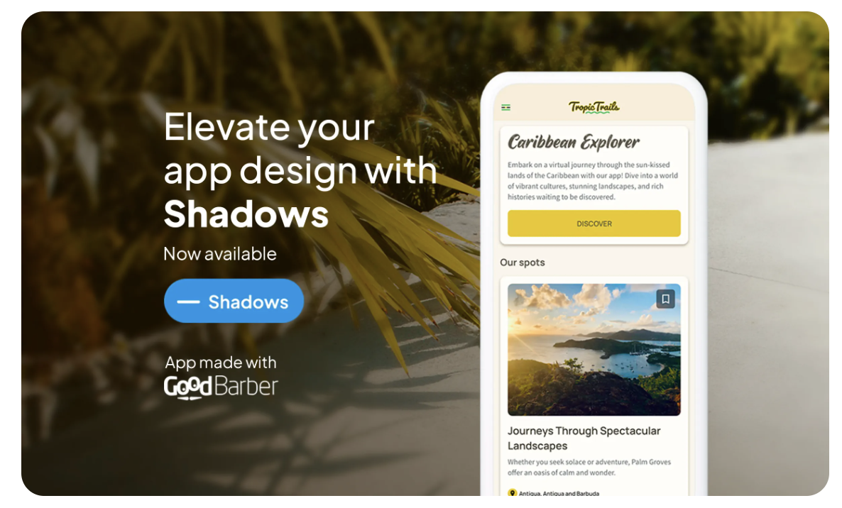 Noi di GoodBarber ci impegniamo costantemente a fornire strumenti di progettazione avanzati ed esteticamente gradevoli. Pertanto, siamo entusiasti di annunciare la nostra ultima innovazione di design: l'opzione Ombra, ora disponibile nei nostri modelli di layout più recenti.