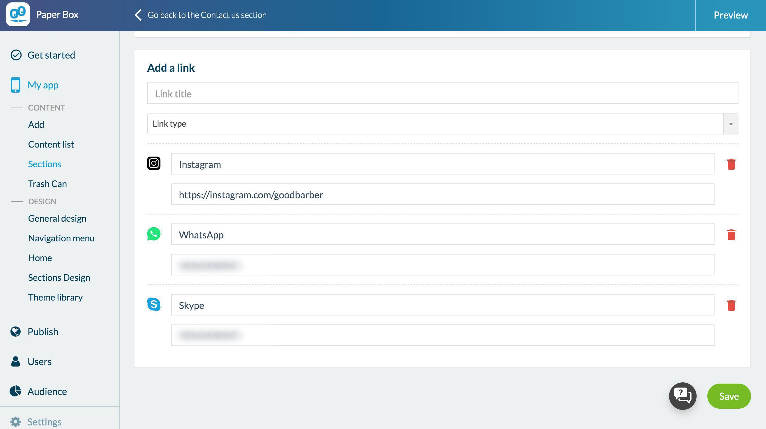 Per configurarli, vai su Contenuto > Sezioni > Contatto > Modifica contenuto. Scegli il tipo di collegamento che desideri aggiungere dal menu a discesa e inserisci le informazioni richieste.