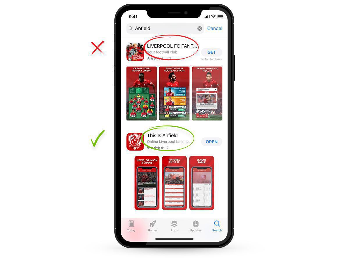 Apple consente un massimo di 30 caratteri nel titolo e nel sottotitolo della tua app. Ma se, ad esempio, fai una ricerca nello Store con un iPhone X, nella pagina dei risultati vedrai solo i primi 19 caratteri del titolo e i primi 25 caratteri del sottotitolo. L'utente può visualizzare tutti i 30 caratteri solo dalla pagina dell'app. Per un impatto migliore, evita che i testi vengano abbreviati nelle pagine di ricerca sugli iPhone.