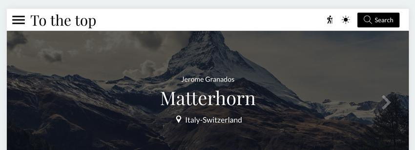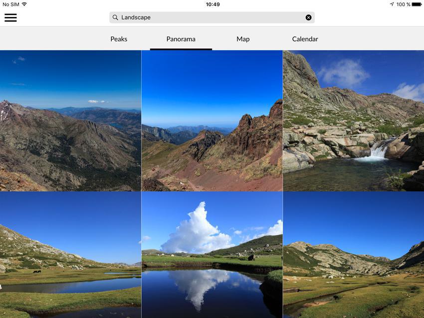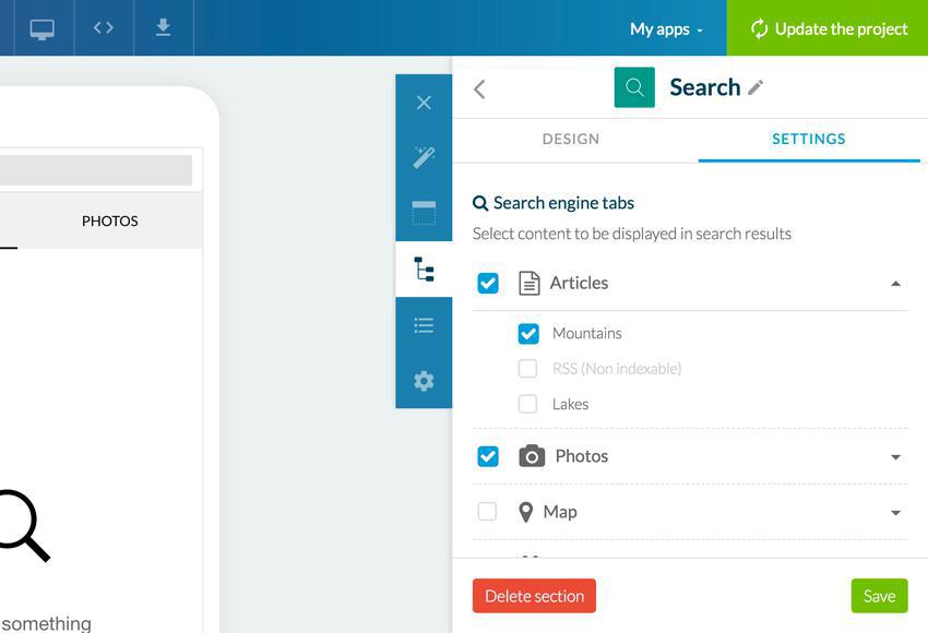 Per ogni categoria puoi anche selezionare le sezioni dove verrà attivata la ricerca. Nell'esempio in basso, ho deciso di attivare la ricerca in tutte le sezioni foto della mia app e per gli articoli sono nella sezione "Mountains". Devi inoltre sapere che se in una determinata sezione non è possibile effettuare una ricerca, questa non apparirà nel pannello. Nel mio esempio è il caso della sezione RSS.