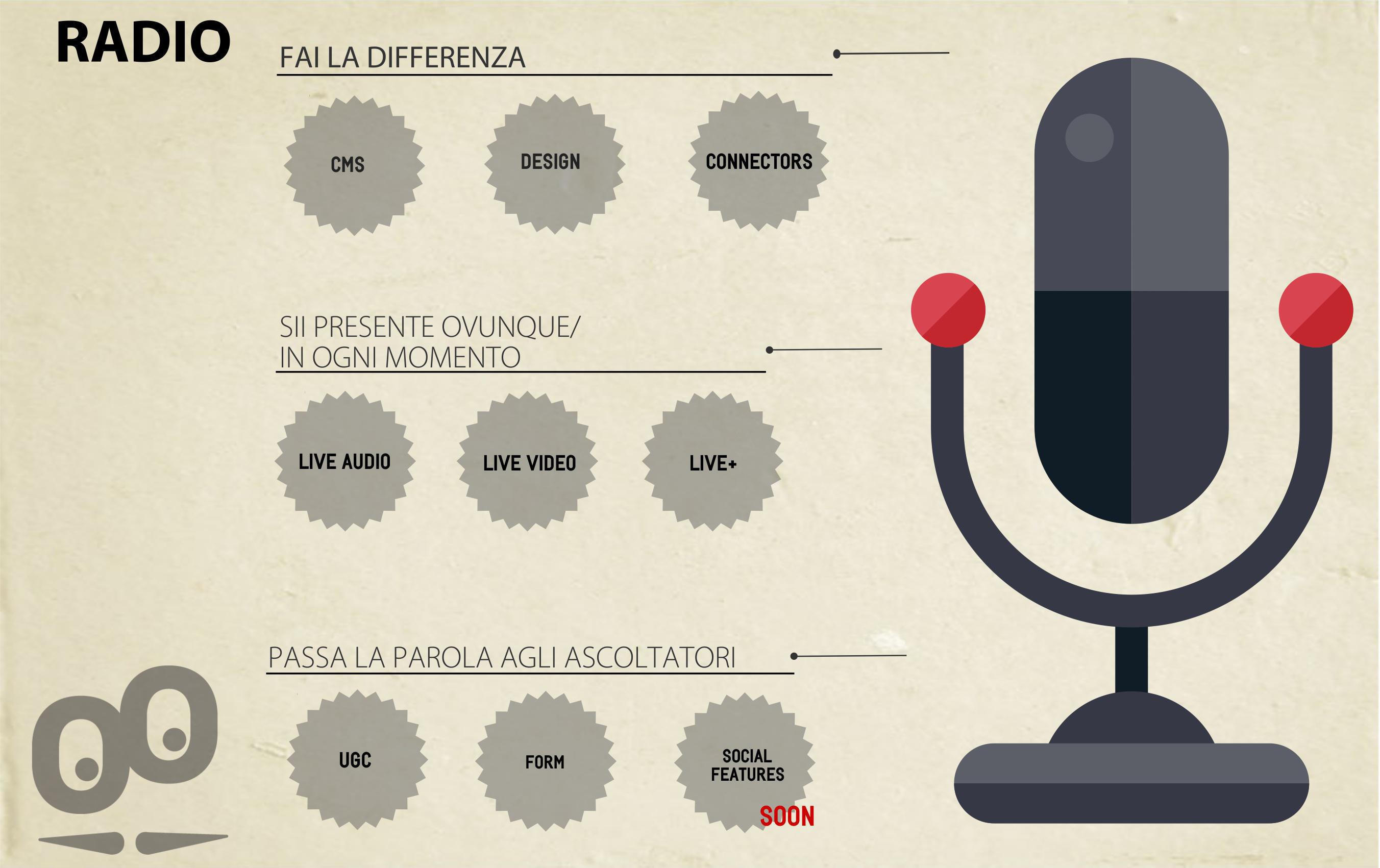 - Dai voce agli ascoltatori: coinvolgere è la parola chiave per una radio. È possibile inserire una sezione o la sezione Modulo per organizzare dei concorsi o semplicemente dei sondaggi. È interessante anche autentificare l'utente e usare tutte le features social che arriveranno a breve, per dare alla radio un aspetto più fresco e creare un'importante comunità.