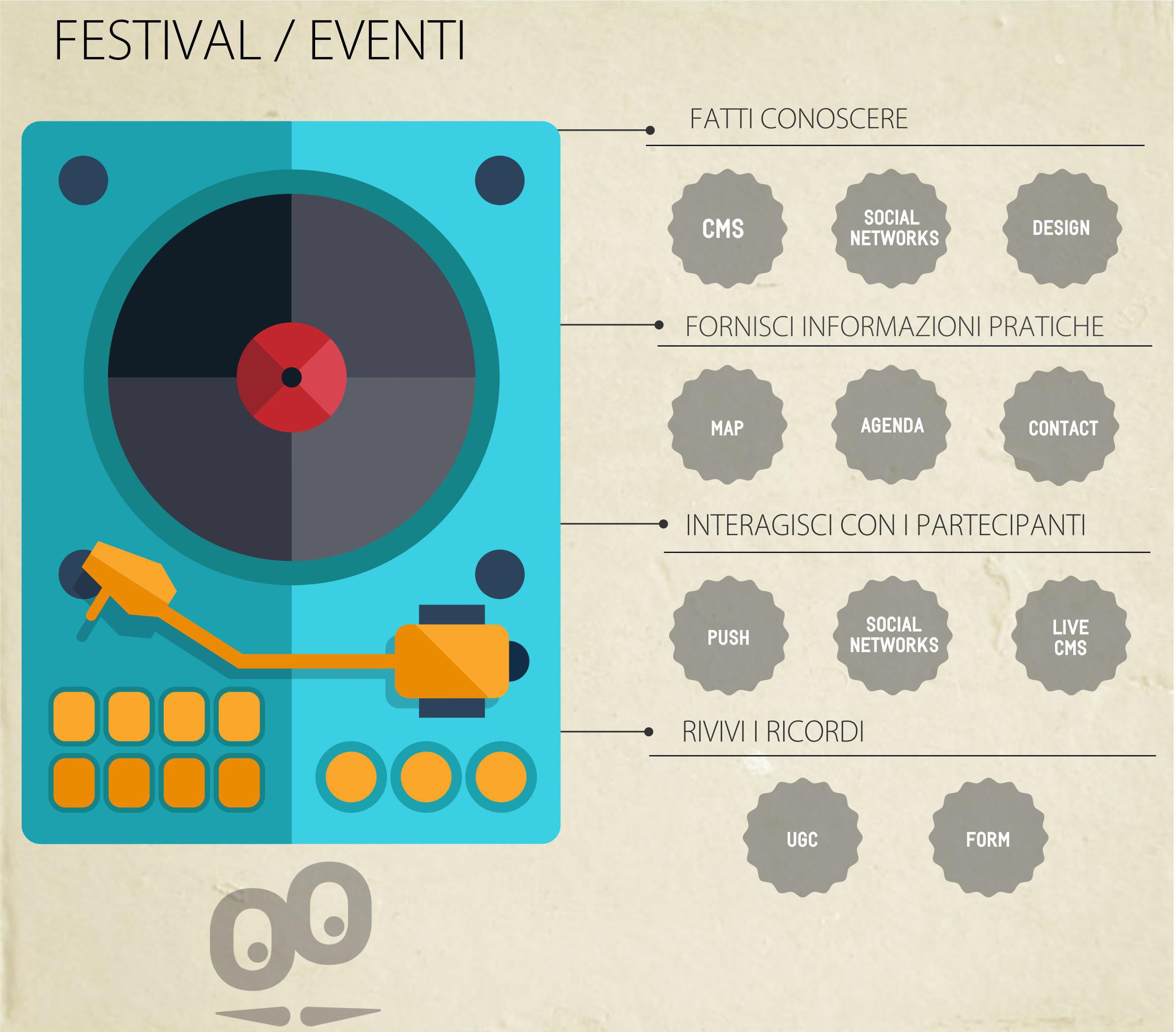 - Fornisci le informazioni pratiche: in un festival o un evento è importante che i partecipanti sappiano cosa succede, quando e dove. Integra pertanto la Mappa, l'Agenda e la sezione Contatti.