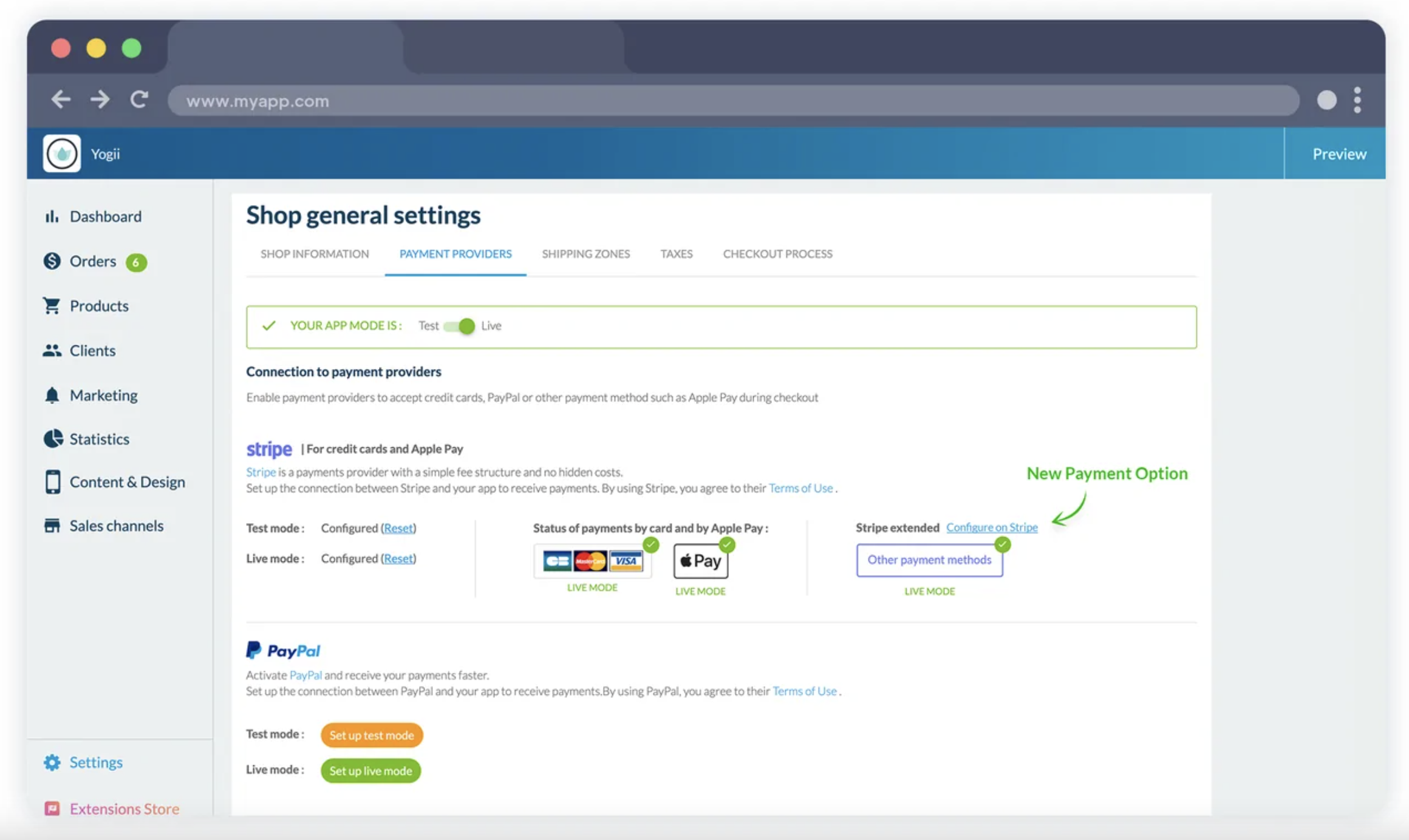 Stripe era già disponibile per accettare pagamenti con carta, richieste API di pagamento basate su browser, pagamenti in negozio (conto cliente) e Apple Pay sulla vostra app. È bastato aprire un account (5 milioni) e il vostro negozio online era pronto a registrare i primi pagamenti con carta.
