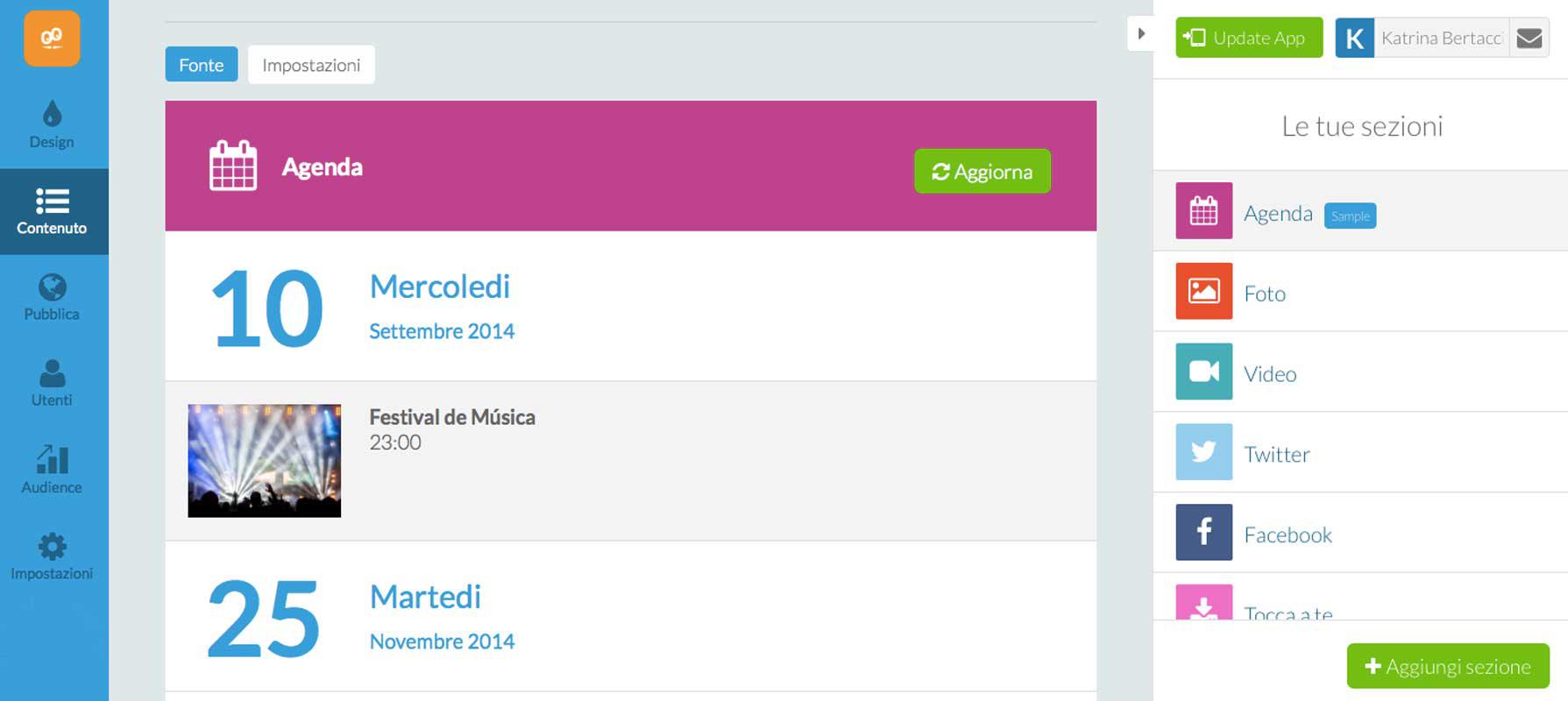 3. Potete visualizzare la lista di tutti gli eventi già dalla sezione contenuto del back office, oltre che nell’anteprima, in questo modo avrete sempre il totale controllo dei vostri eventi. Un’altra novità che abbiamo introdotto è il tasto “Aggiorna” per forzare la sincronizzazione dei contenuti.