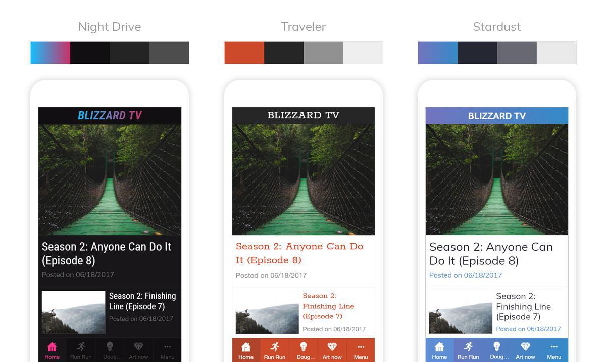 Ogni tema di colori ha delle caratteristiche ben definite: alcuni hanno il gradiente anche nei titoli e nell'immagini di sfondo, altri invece prediligono i colori a tinta unita. GoodBarber ti propone in totale 31 temi differenti.
