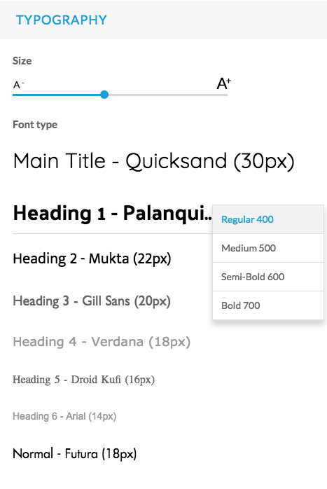 Esiste una precisa gerarchia per ciò che riguarda i testi dell'app. 8 differenti livelli per far visualizzare titoli, sottotitoli e paragrafi. Un cursore ti permette di definirne le varie dimensioni. Il Global Style calcola dunque automaticamente le dimensioni di ciascuno di questi livelli in modo da rispettare tale gerarchia.