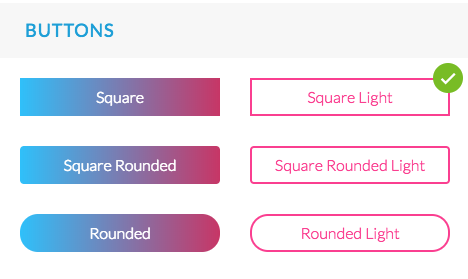 Per i pulsanti dell'app che invitano l'utente a effettuare delle azioni, è possibile sceglierne il design. Tale design è sempre in funzione del tema di colori, col fine di rispettarne l'armonia. Hai a disposizione 8 diverse declinazioni per ogni tema.