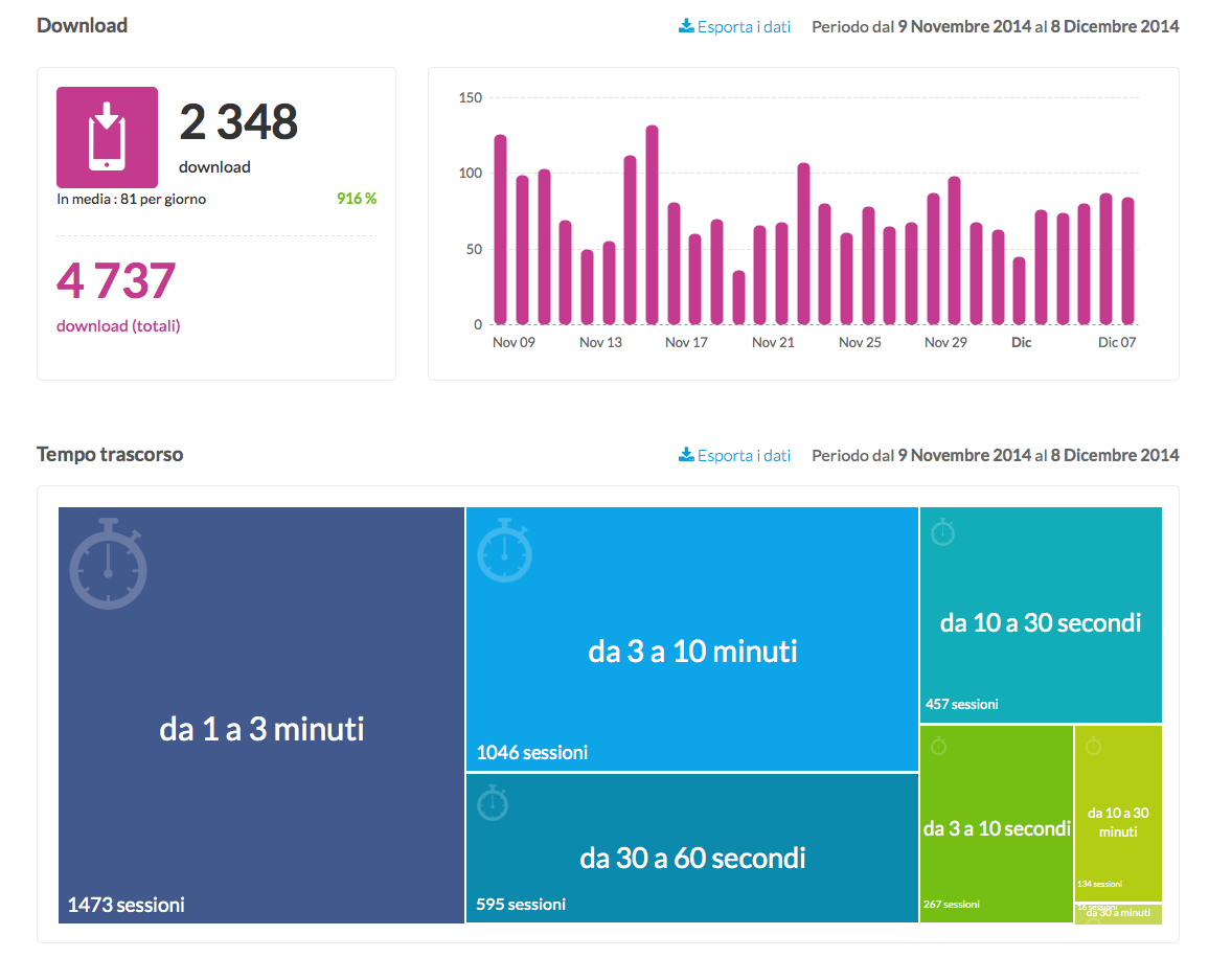 Questo tipo di dati vi da informazioni sul comportamento dei vostri clienti con il vostro prodotto. In riferimento ad un app sarebbe quante volte un utente la apre, quali sezioni visita di più, quanto tempo rimane in una pagina (legge un articolo intero o naviga velocemente attraverso i vostri contenuti?). Come abbiamo già detto spesso, se siete utenti di GoodBarber, potete trovare tutte queste statistiche direttamente nei vostri back office! Potete anche integrare i dati con quelli di fonti esterne come Google e Flurry.