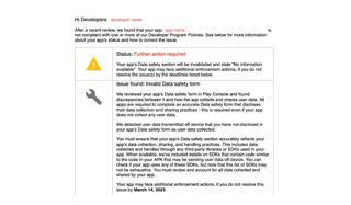 Nel 2021, Google ha annunciato ulteriori dettagli per la sezione Sicurezza dei dati su Google Play. Gli sviluppatori sono ora tenuti a comunicare a Google le pratiche di privacy e sicurezza delle loro app compilando un modulo nella Play Console. Queste informazioni verranno mostrate nella pagina dello Store della vostra app per aiutare gli utenti di Google Play a capire come la vostra app raccoglie e condivide i dati degli utenti prima del download.