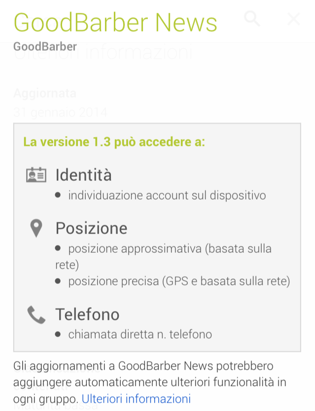Ecco i permessi che un'app di GoodBarber richiede sempre: